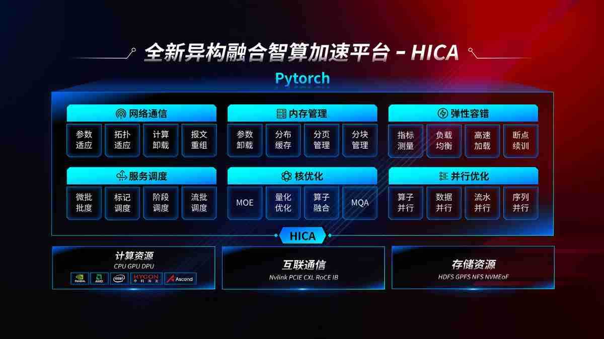 通过自研的服务层、、、中间适配层、、以及调度编排算法,,,采用数据并行、、、、模型并行等多种并行方式,,,,把并行计算任务进行有效的分解,,使其分别由相应的软件栈和算力资源来承接。。。。当GPU资源变化,,,,HICA可以实时动态调度计算子任务并调整模型拓扑和架构,,,,以充分聚合各种算力资源。。。。