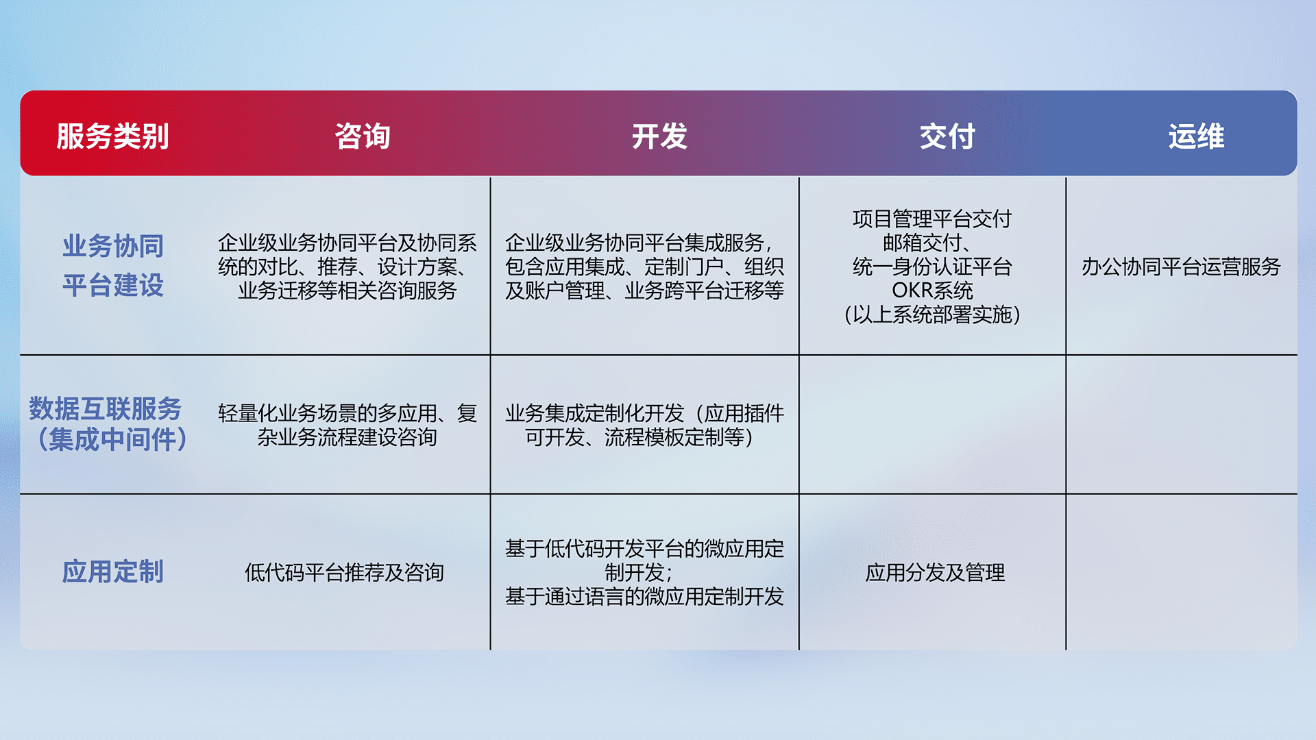 针对钉钉、、企微、、、IDaas等平台级产品提供产品的规划、、方案、、、交付、、、定制化开发等服务,,实现如统一协同办公、、、、智能客户服务、、、混合会议管理、、、、智能数据查询、、等业务场景,,,实现数字化转型。。。。
